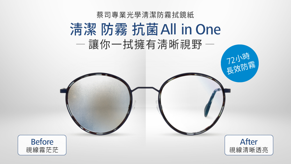 為了確保蔡司AntiFOG發揮最佳作用,應先使用專用的蔡司清潔布清潔鏡片。