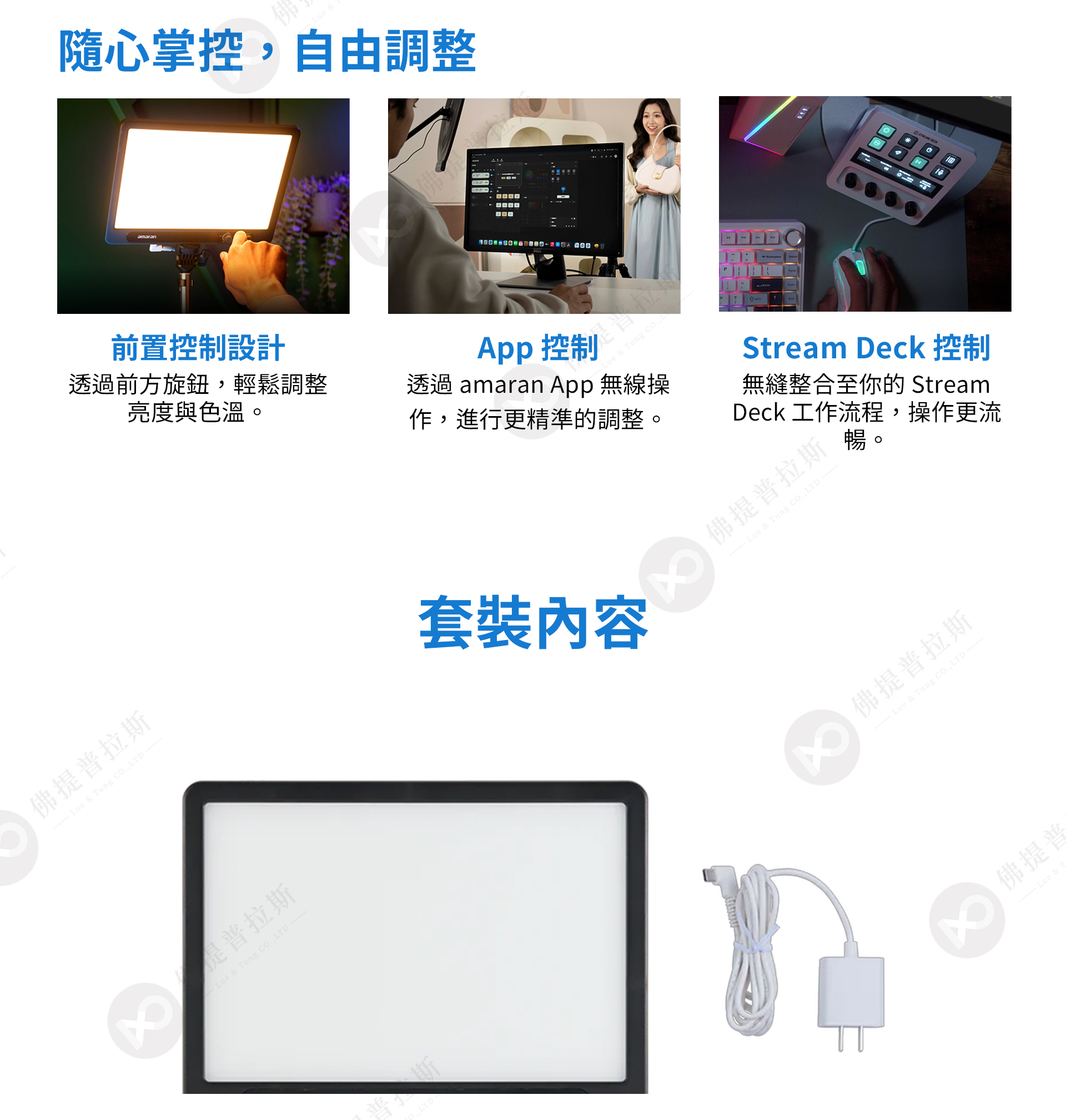 ★多種控制方式隨你選擇:使用前方面板旋鈕、透過 amaran 應用程式無線控制,或整合 Stream Deck