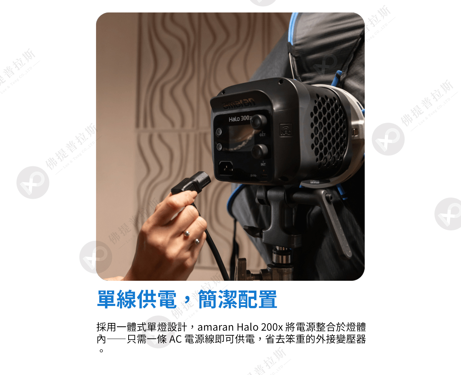 ★一體式設計,簡化配置:採用精簡的一體式單燈設計,僅需一條 AC 電源線即可供電
