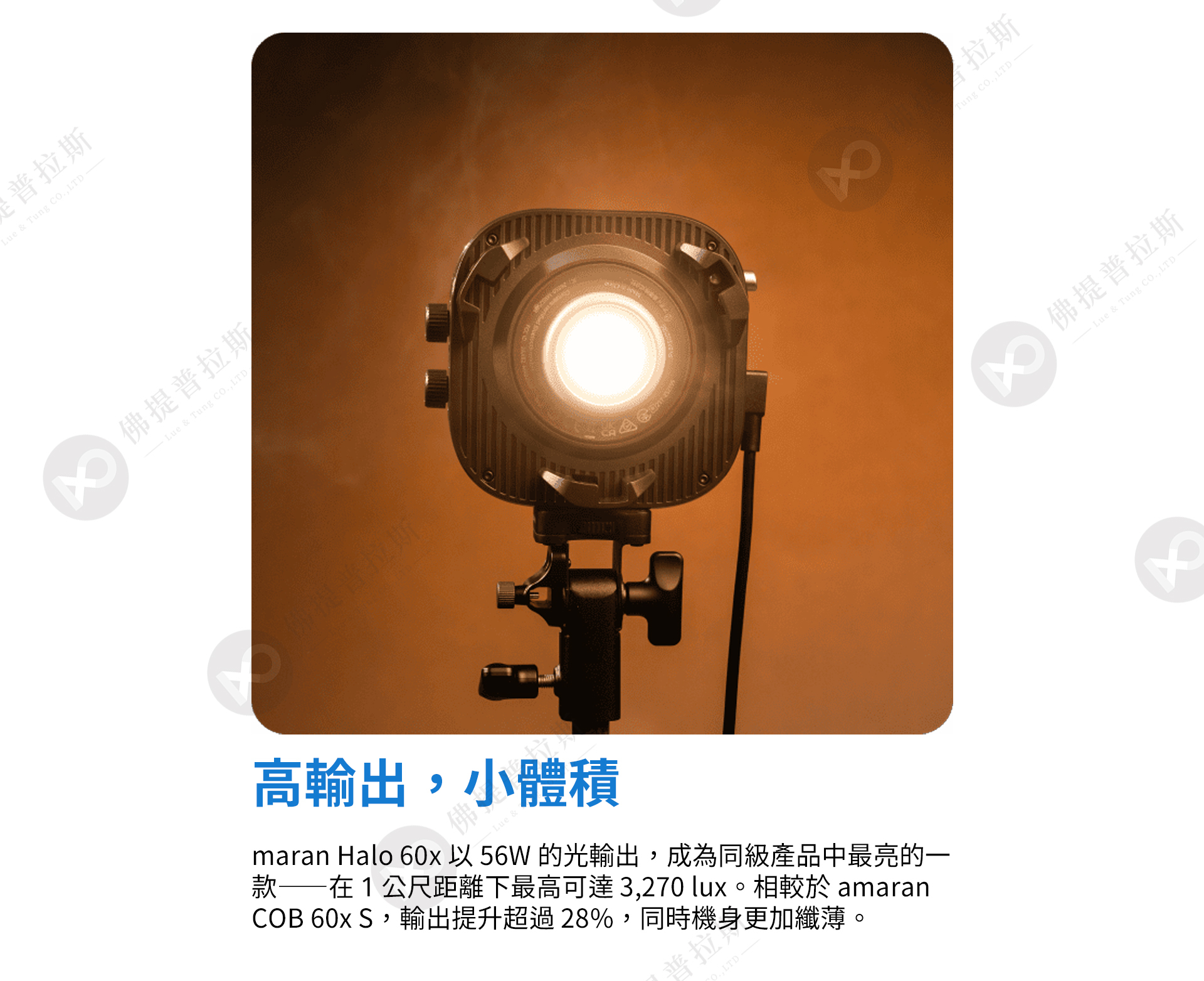 ★同級最佳亮度:在更纖薄的機身下,比 COB 60x S 亮度提升超過 28%(裸燈於 1 公尺距離最高可達 3,270 lux)