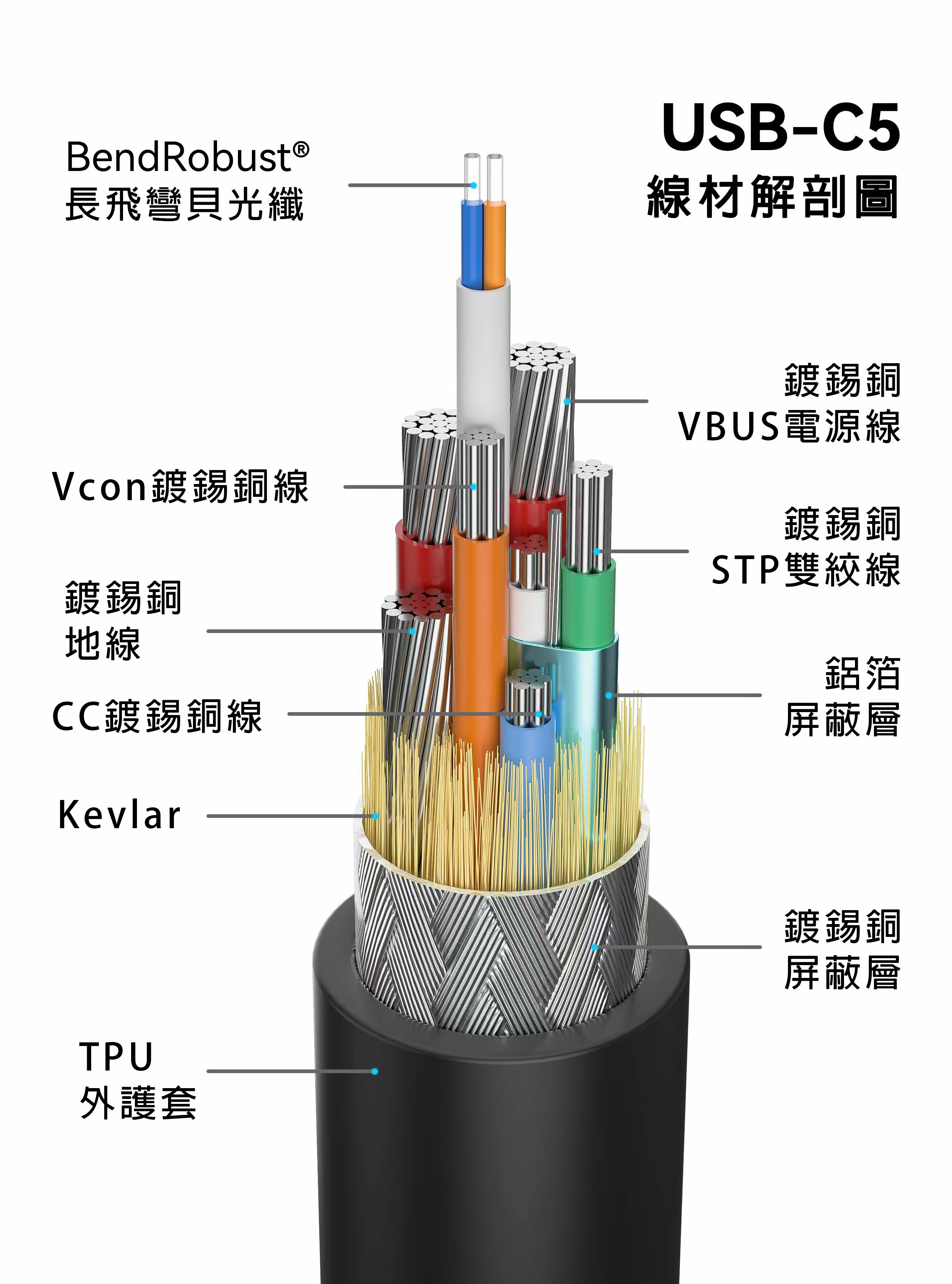 Fibbr採用長飛 BendRobust 特種光纖,卓越的抗彎折抗老化性能,FIBBR USB-C5 是專為專業用戶打造的 USB 3.1 Gen1 光纖數據線,支援穩定5Gbps 以上的傳輸速度,即便長達 5 公尺,也能保有卓越性能。