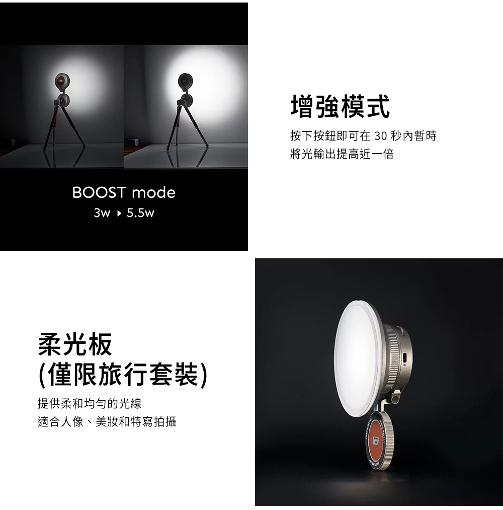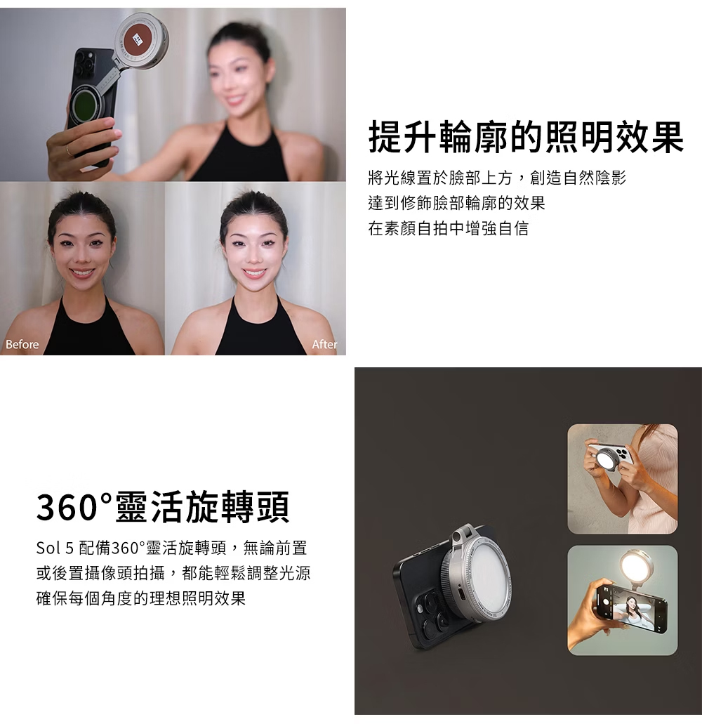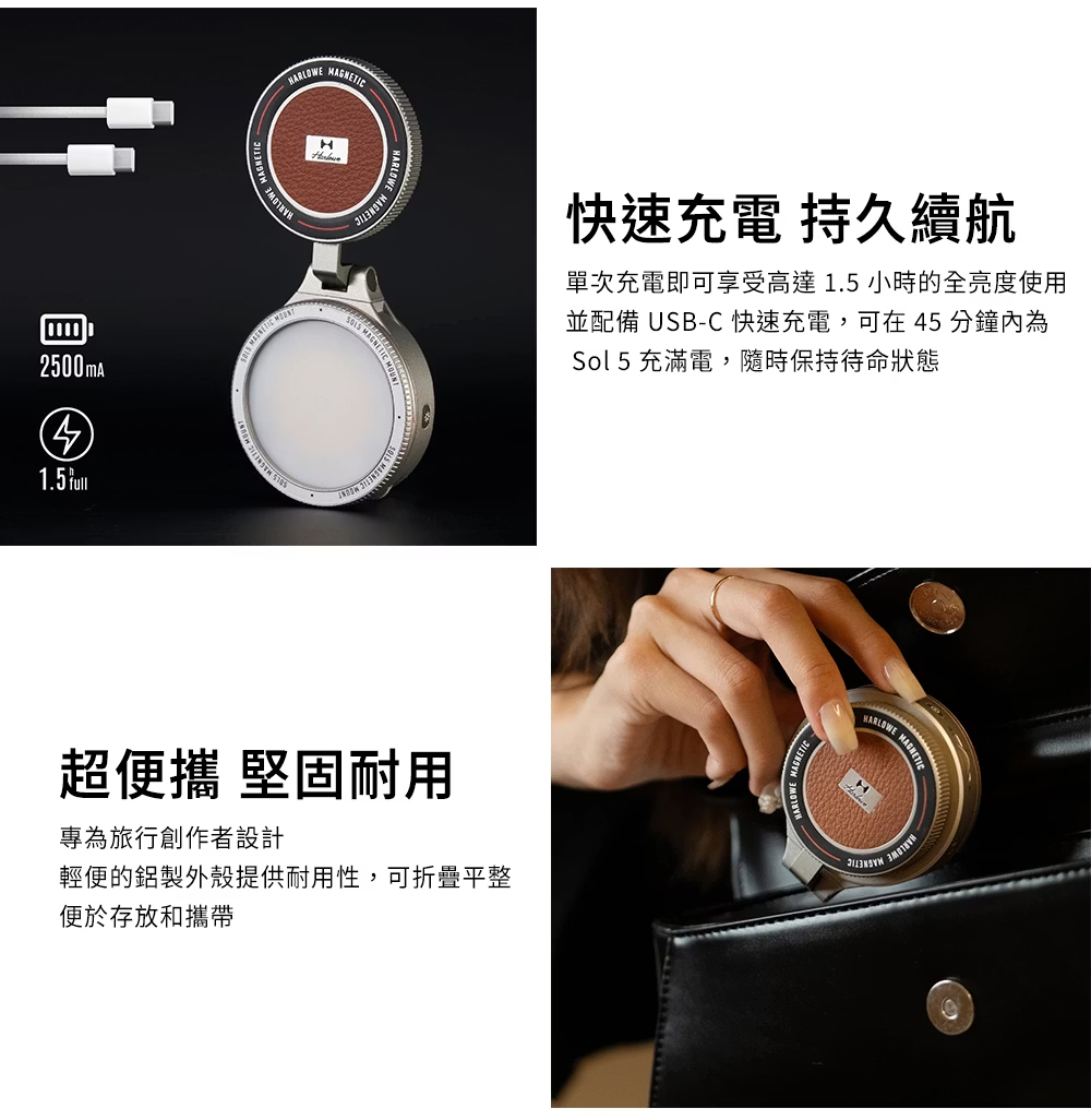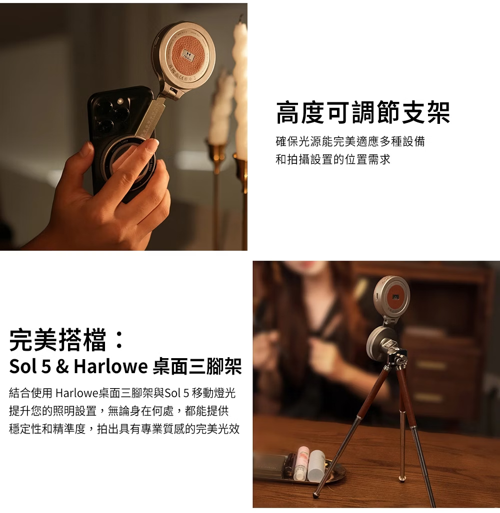 Harlowe 或泊 Sol 5 雙色移動補光燈Harlowe Sol 5 手機燈,專為創作者設計,提供可調色溫與增亮模式。輕便的設計讓您的創作隨時充滿光彩。