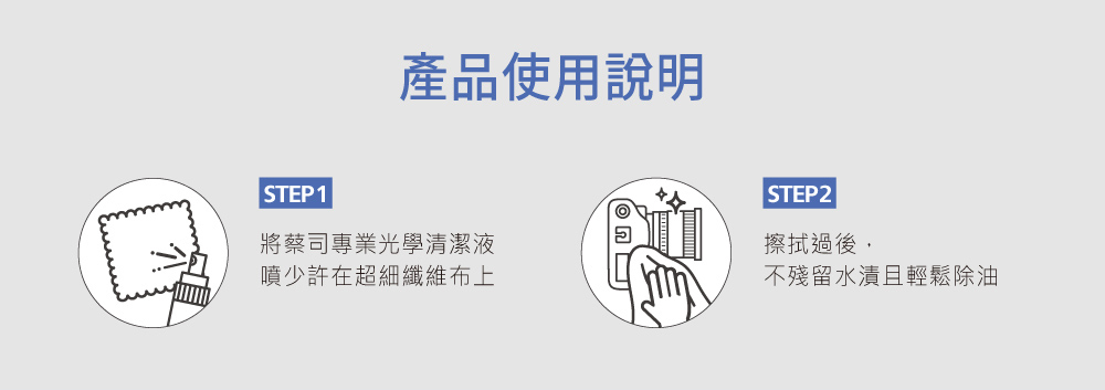 適用於所有玻璃和塑膠眼鏡鏡片(特別是高品質的塗層鏡片),可搭配乾淨的超細纖維布一起使用,達到最佳潔淨效果。