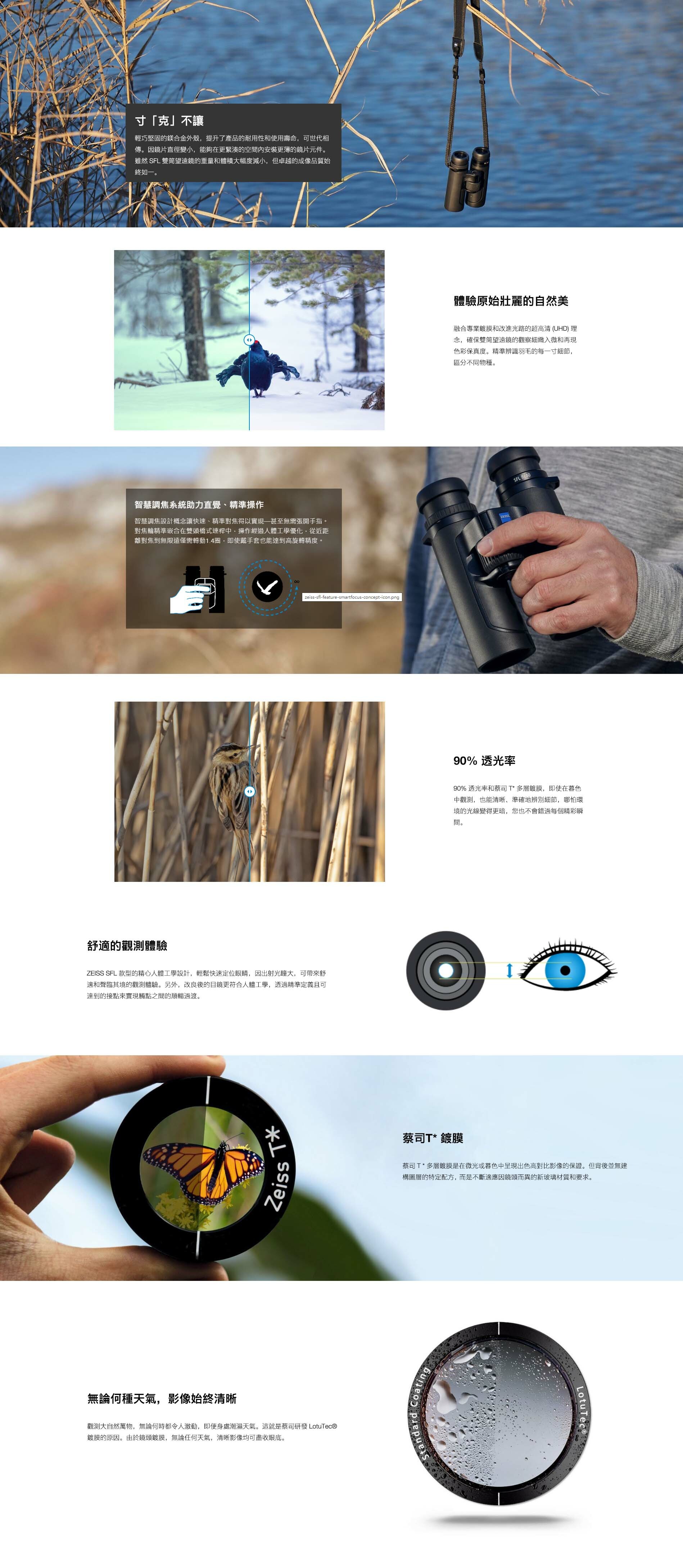 ZEISS SFL 雙筒望遠鏡(SFL 是SmartFocus Lightweight 的縮寫)帶您輕鬆捕捉美妙時刻。輕巧緊湊,盡其所能,SFL 雙筒望遠鏡讓SF 系列產品至臻完善。全新的超高清(UHD) 設計理念確保逼真的色彩還原和高清細節再現。憑藉智慧調焦系統和位置精準的調焦圈,即使在戴手套時也能實現快速精準的對焦。經優化的人體工學設計和大出射光瞳,賦予您輕鬆且不受外界幹擾的觀測體驗。